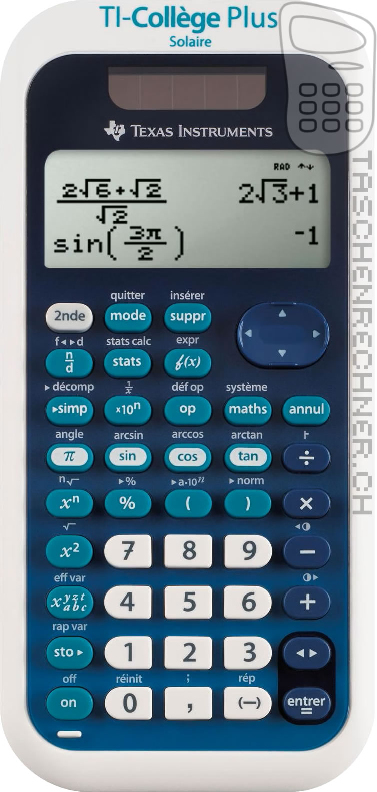 Spécialement conçue pour les programmes scolaires au collège, la TI-Collège™ Plus Solaire est dotée de touches et de menus entièrement en français. Son panneau solaire intégré permet de réduire la consommation d’énergie de la batterie en cas d’utilisation fréquente ou si de la prolonger l’élève oublie de l’éteindre.